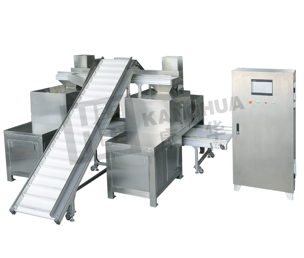 將兩臺單獨的刨片機組合,實現(xiàn)上料,分流,稱重,切制,出料全自動的生產(chǎn)過程。進料端設有輸送式儲料箱,可以儲存較大量原物料,減少人工加料次數(shù)。運行全程由PLC微電腦控制操作,具有連續(xù)作業(yè)、能耗低、產(chǎn)量高等優(yōu)點。符合GMP要求。