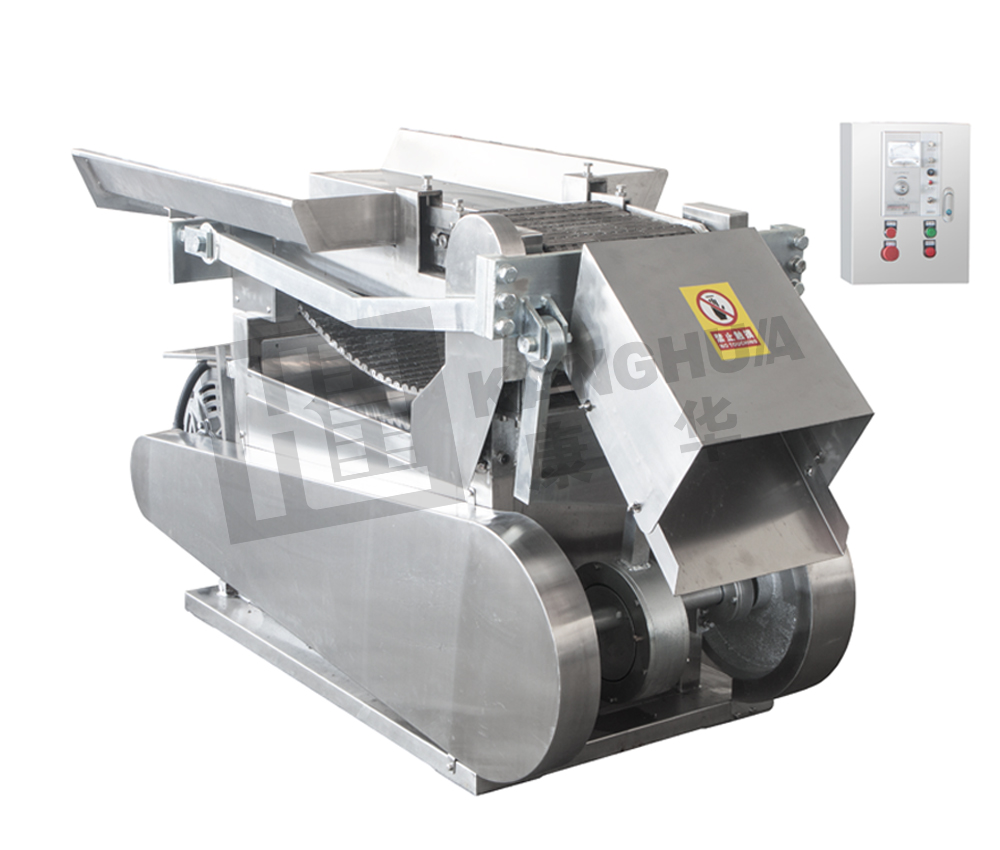 采用機(jī)械偏心機(jī)構(gòu)傳動,使刀片上下往復(fù)運(yùn)動,原料經(jīng)輸送鏈送至刀門,切制成所需要厚度的飲片。