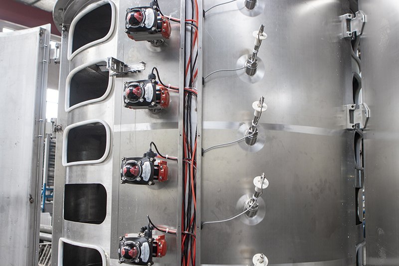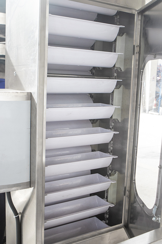 結(jié)構(gòu)、工作原理及使用特點(diǎn):本機(jī)由烘箱、振動(dòng)底座、自動(dòng)上料機(jī)構(gòu)、抽濕裝置、冷卻裝置、連接風(fēng)管、蒸汽換熱器、風(fēng)機(jī)等組成。當(dāng)蒸汽進(jìn)入換熱器后進(jìn)行熱交換,產(chǎn)生高溫干燥熱空氣通過強(qiáng)力風(fēng)機(jī)的作用,由下而上進(jìn)入烘箱,同時(shí)物料在自動(dòng)吸料機(jī)構(gòu)的作業(yè)下自頂部進(jìn)入烘箱,熱空氣與物料在烘箱內(nèi)進(jìn)行逆流交換,物料在振動(dòng)電機(jī)的作用下沿阿基米德螺旋線翻滾走動(dòng),并與熱風(fēng)充分接觸,從而達(dá)到干燥效果。烘箱上部連接吸濕裝置,及時(shí)排除烘焙時(shí)產(chǎn)生的濕氣。烘箱內(nèi)裝有網(wǎng)板,以滿足不同大小的物料烘干要求。全自動(dòng)振動(dòng)烘干設(shè)備最大特點(diǎn)是能源能充分利用、工作連續(xù)性好、物料干燥均勻、生產(chǎn)量大、操作方便、衛(wèi)生條件好、易清洗、易維護(hù)、適用范圍廣。整機(jī)均由全不銹鋼制作,符合GMP要求。本機(jī)適用于烘干帶濕潤水的物料,不適合烘干含有結(jié)合水的物料。